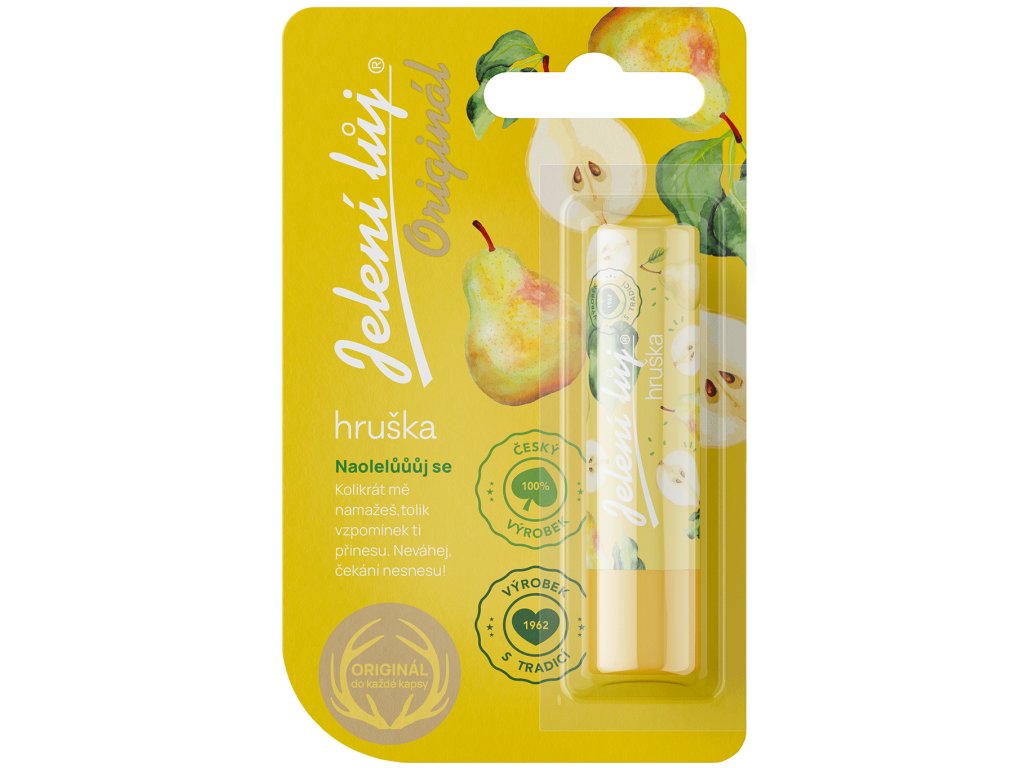 Je nenápadná. Když se řekne ovoce, hruška padne skoro jako poslední. Ale jak se od šťopky dolů rozšiřuje v impozantní plod, jsou i její chutě a struktura stále intenzivnější. Jelení lůj na to jde stejně. Aplikuj na rty. Vnímej regeneraci a uklidňující pohodlí. Pak chuť a vůně z pohádky. Vzpomínky na babičku. Letní ovocné osvěžení, nečekaná chuť limči, co tě odstřelí na letní koupačce. Podzimní vitamínový nášup. Neotřelá chuť marmelády. Nečekané kombinace a emoce ve hmotě Jeleního loje - receptury, kterou ladíme už přes půl století. Tady se potkává nostalgie, tradice a osvěžující pohoda.