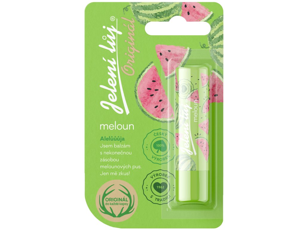Oslaď rtíky melounem | Chutná jako cukrová vata a sladký polibek uprostřed rozpálené pláže. Klepou se ti kolena? Aby ne, takovou slaďárnu člověk jen tak nezažije. Oslň leskem celou zem | Netvař se jak pecka a rozdávej úsměvy na potkání. Melounový Jelení lůj pokrývá rty jemně lesklým filmem, který ti dodá neodolatelné sebevědomí. Slunce, pusy, hurá ven | Nebojíš se dělat vymelouniny! Jistota klidného úsměvu roste také s pocitem bezpečí. Jelení lůj poskytuje takovou ochranu rtů, že si budeš připadat bezpečně i při největších loupežničinách nebo třeba nepřízních počasí. Tvůj úsměv zůstane díky ochranné vrstvě stoprocentní pod kanonádou slunečních paprsků i kapek deště velkých jak trakaře.