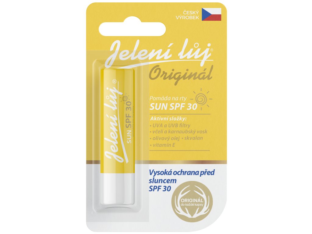 Jelení lůj | SUN SPF 30 chrání rty před slunečními paprsky, extrémním horkem, mrazem, i dalšími nepřízněmi počasí. Zároveň je hydratuje a regeneruje.